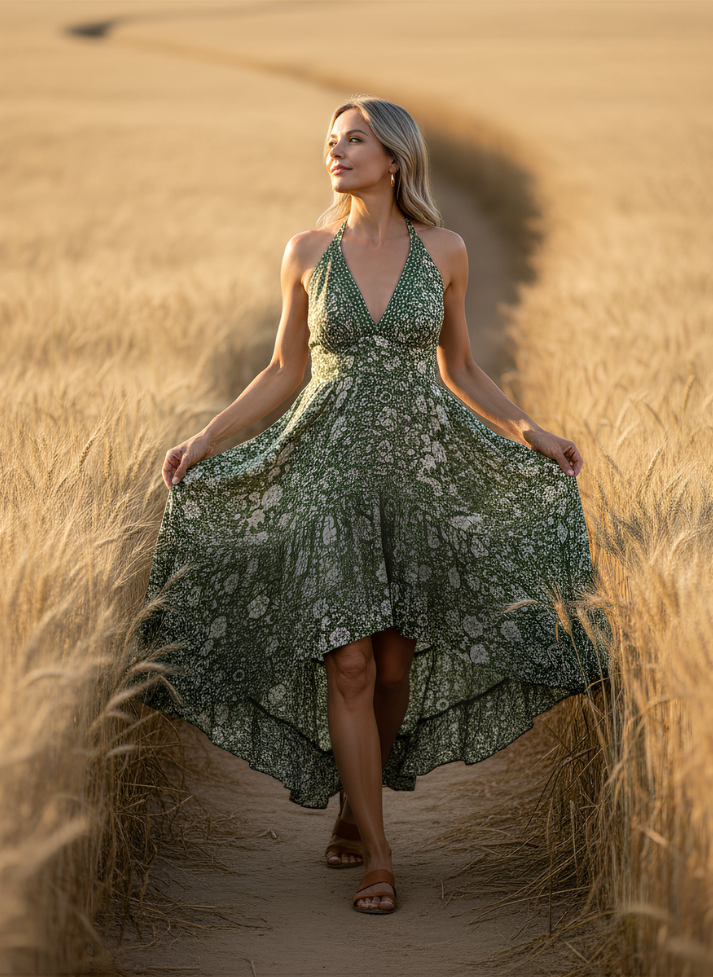 Effortlessly chic and comfortable, this halter neck dress features a flattering fit with a drawstring back for a custom silhouette. Crafted from soft, breathable fabric with a flowy drape, it’s perfect for sunny days, beach outings, or casual getaways.