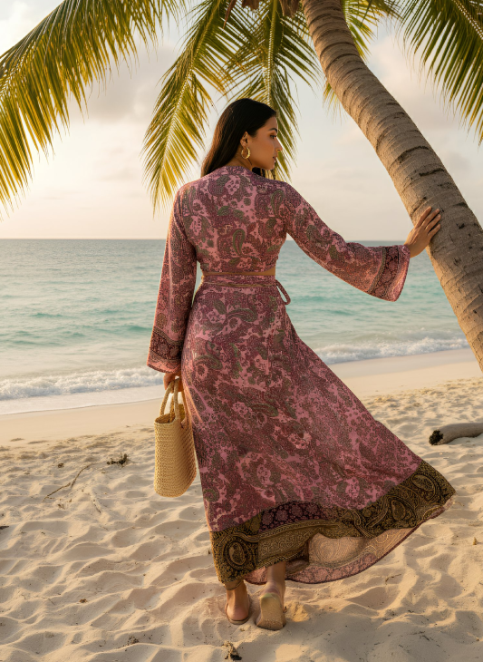Set comprises of a reversible skirt that can be also worn as a wrap around halter neck dress, with matching wraparound top that can also be worn with or without the dress giving multiple ways to create your own look and style to adapt to changes of scene throughout the day.